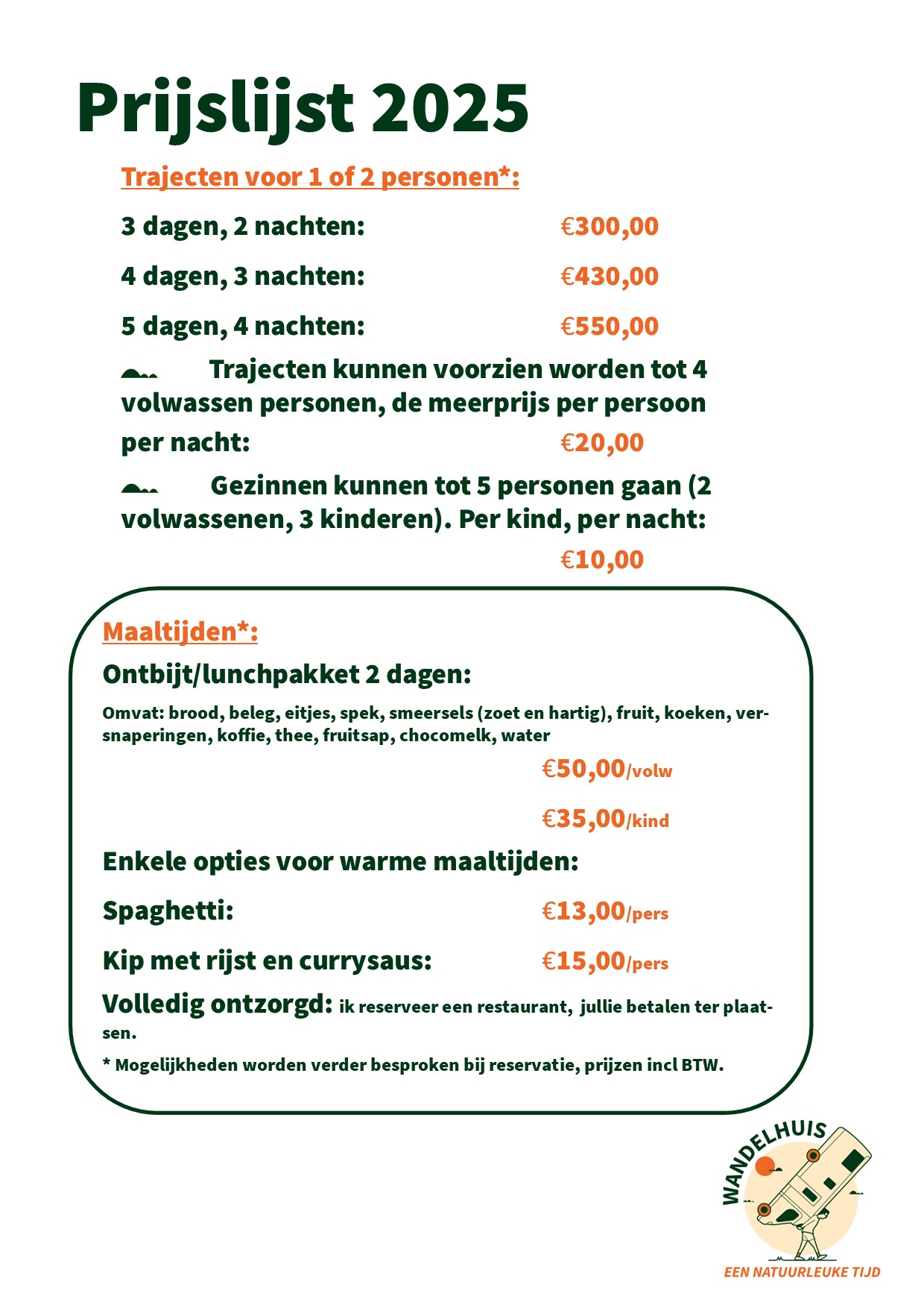 Laat u verwennen met heerlijke catering tijdens uw wandelvakantie. We werken samen met de lokale handelaars en vullen dagelijks bij zodat jullie niets te kort komen. Jullie kunnen op voorhand kiezen om zelf maaltijden op te warmen/ koken of uit te gaan eten in een restaurant vlakbij jullie overnachting locatie. Kijk op onze homepage voor info over de prijzen.